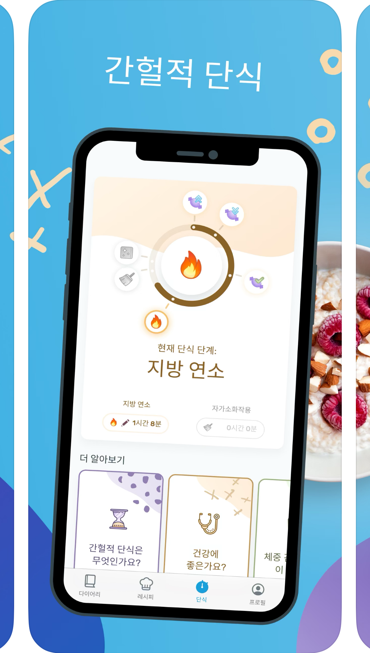 개인의 생활 패턴을 고려한 식단 계획 기능이 강점이며, 하루 섭취량 목표를 시각적으로 안내합니다.